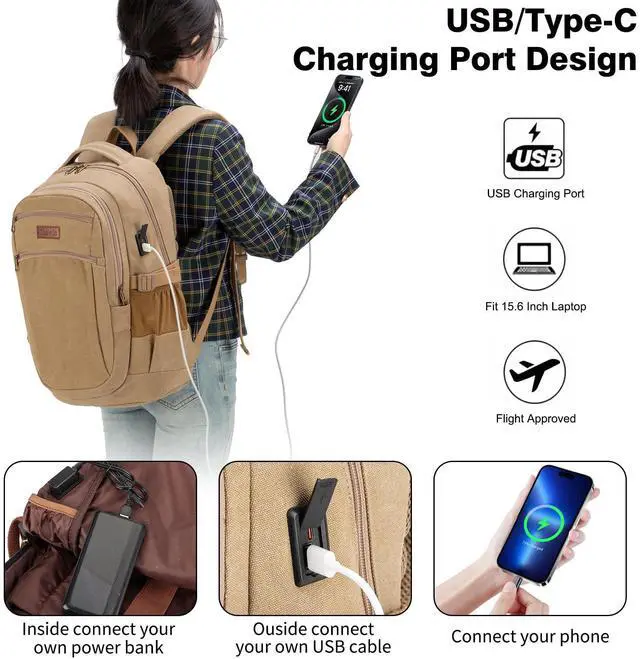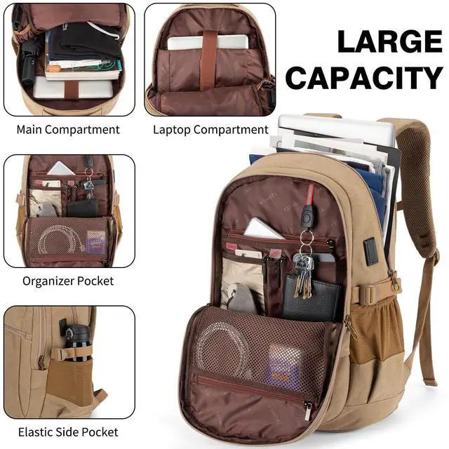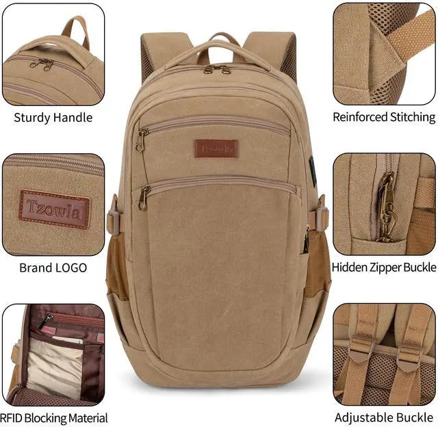 Tzowla Vintage Canvas Laptop Backpack for Men and Women,College Travel Work Rucksack with USB/Type-C Charging Port,Lightweight Bookbag Hiking Casual Daypack Backpacks Fit 15.6 Inch Notebook(Khaki)