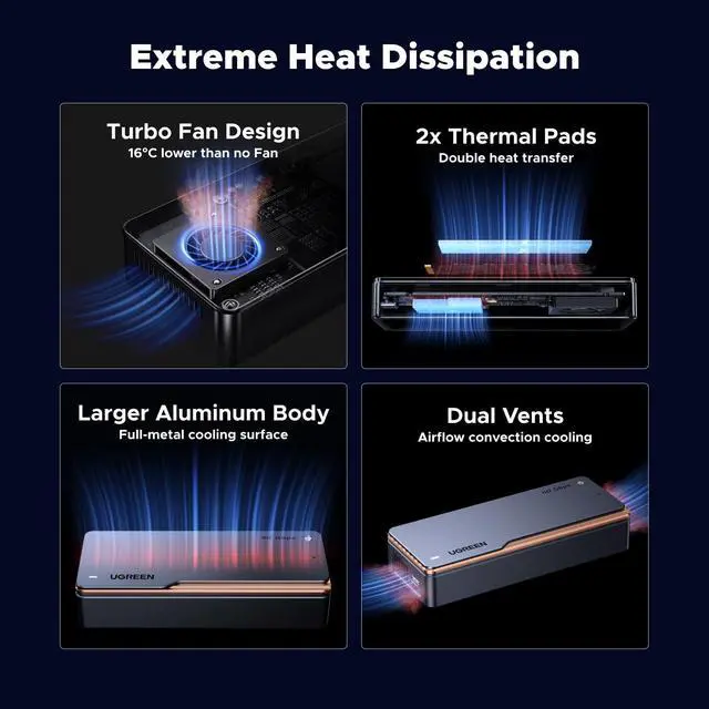 Advanced Heat Dissipation SystemAluminum housing + smart cooling fan ensure efficient heat dissipation. The fan automatically activates when the internal temperature exceeds 40°C, protecting your SSD during heavy use.