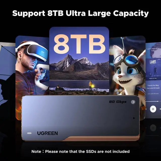 Supports 8TB NVMessd not includedSupports up to 8TB M.2 NVMe SSD, ideal for handling large files, video editing, and backups. Note: Compatible with Windows, macOS, and Linux. Supports 2280-size M.2 NVMe M-Key or M&B Key. Not compatible with SATA-based SSDs pcie 5.0 SSD and 9100 ssd