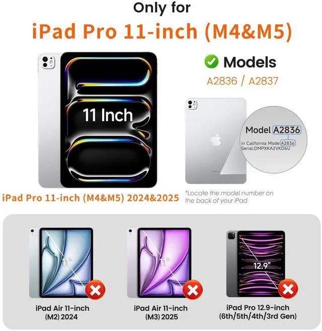 Perfect CompatibilityCompatibility: Specifically compatible with iPad Pro 11 Inch (M5/M4) 2025/2024, compatible with the Apple Pencil. Fit models: A2836, A2837. Please check back bottom of your device to find the model number.