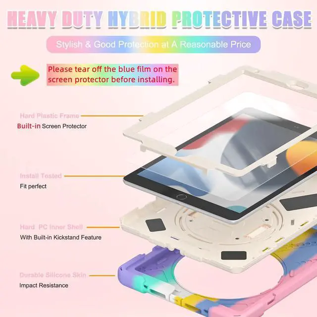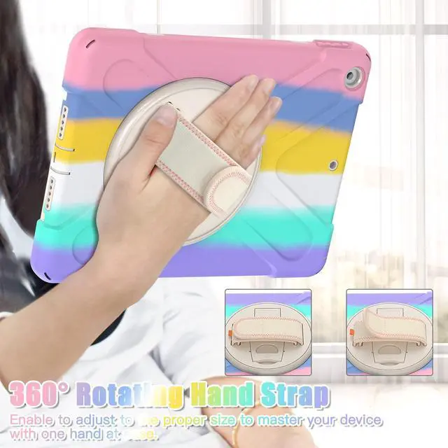 TSQ Case for iPad 9th 8th 7th Generation for Kids Girls Women with Screen Protector & Stand & Hand Strap 2021 2020 2019 | Cute Rainbow Pink Cover Case for iPad 10.2 Inch