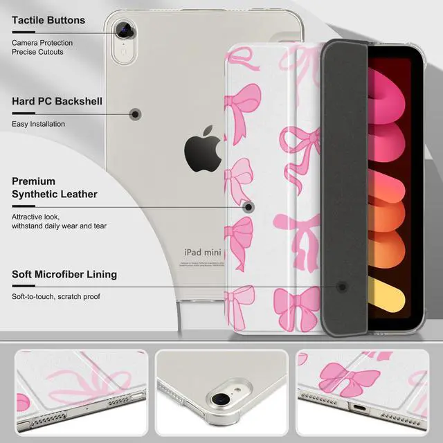 MecBevia Product Descriptionfor iPad mini 7th/6th Generation Case Upgrade your iPad mini experience with the MecBevia protective casedesigned exclusively for the iPad mini 7th Generation (2024, A17 Pro) and iPad mini 6th Generation (2021), both with 8.3 -inch displays. This case combines slim style, everyday functionality, and durable protection in one sleek design. The translucent hard back reveals your iPads original color while resisting scratches, fingerprints, and daily wear. A premium PU leather front cover with a soft microfiber lining keeps your screen safe, while the flexible TPU edges absorb shocks and protect against accidental drops.