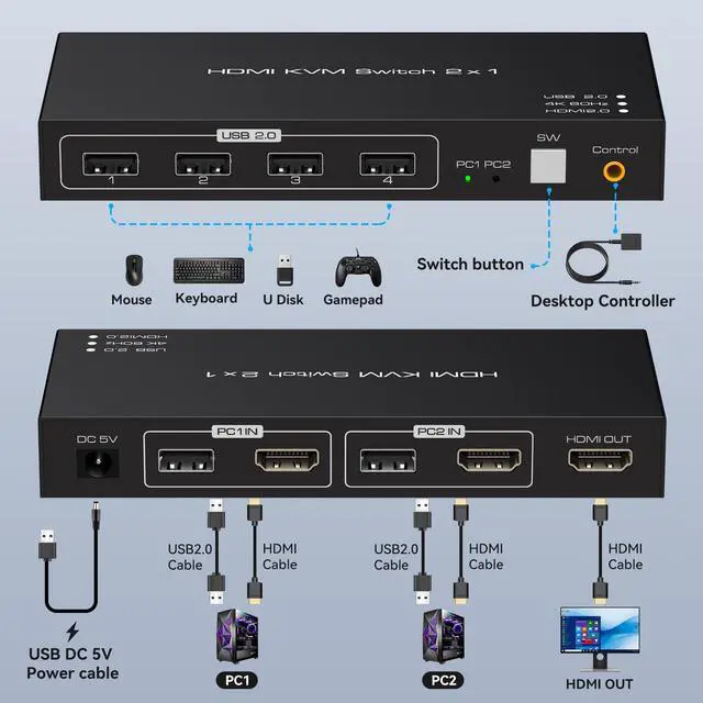 4K@60Hz ResolutionThis kvm switches 2 pc 1 monitor supports HDMI 2.0 standard, the highest resolution up to 4K@60Hz, presenting detailed and realistic ultra-high-definition video effects, allowing you to enjoy high-quality images in the office, gaming, or designing; it's more suitable for users who have high requirements for visual output