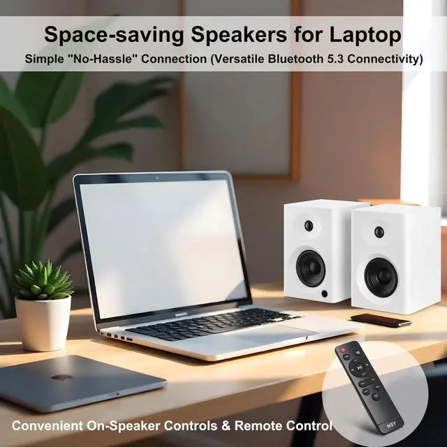 80W Max Output Powered PC Speakers High Resoluton Audio: Powerful 2.0 stereo speakers deliver crystal-clear audio with clear highs and punchy bass, despite the compact size. The NSY-BS401 bookshelf speakers are perfect for gaming, music, and movie. Sufficient power handling for clear and dynamic audio performance, suitable for small to medium-sized home office, living rooms, dining areas. Well-tuned drivers deliver a balanced sound profile with clear highs, detailed mids, and deep lows. Best Father's Day, Birthday, Back-to-School Gift