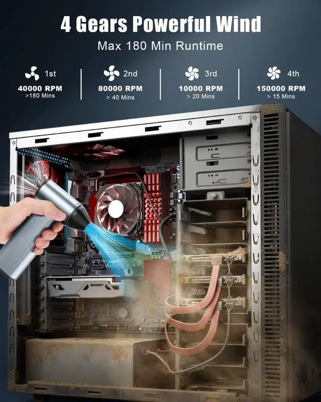 UPGRADED BATTERY LIFE: This air duster features an 8000mAh battery, a 33% increase in capacity(compared to 6000mAh model). It provides u
