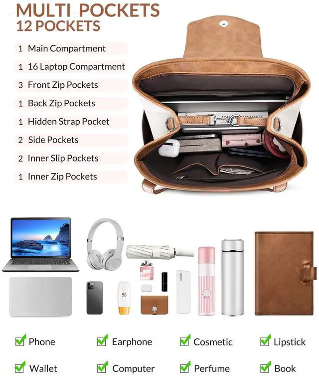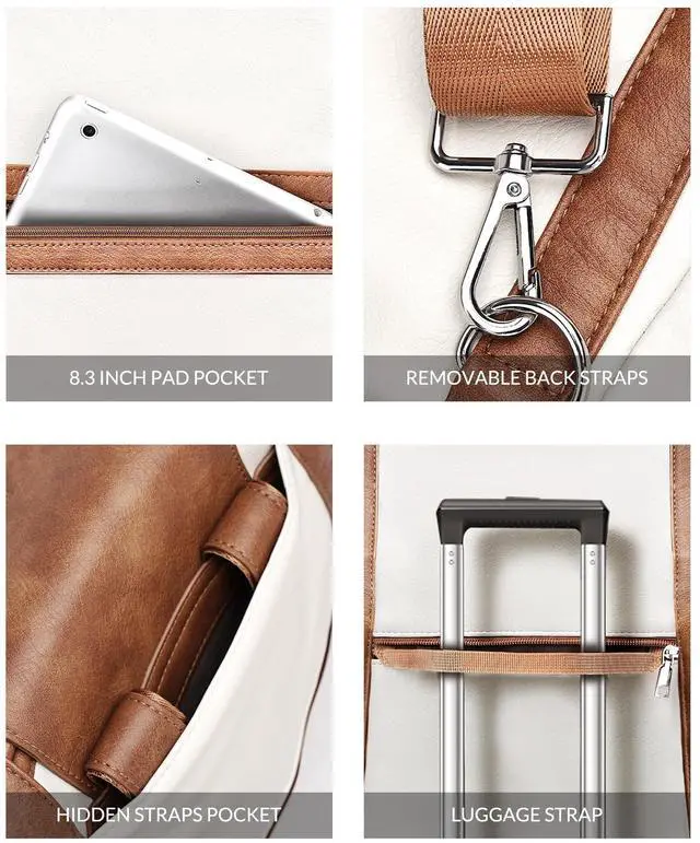 In terms of material, this laptop bag is made of faux leather, which feels delicate and has a rich texture, exuding an elegant and fashionable vibe. The back pack straps are equipped with a breathable mesh shoulder strap with a cotton pad design, reducing the discomfort caused by long-term carrying and ensuring all-day comfort. Even more considerate is that the bag body is equipped with a luggage strap that can be securely fastened to the luggage handle, freeing your hands during travel; it also meets the size requirements of airlines for carry-on luggage and is suitable for use as a boarding backpack.
