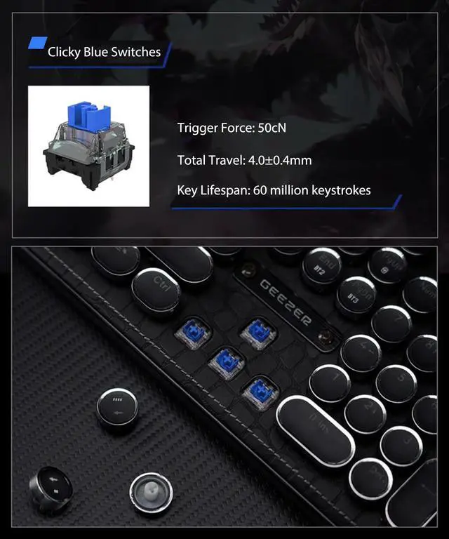[Typewriter Keyboard with Mechanical Switches] - This retro punk keyboard features mechanical blue switches and round keycaps with silver rings, combining vintage