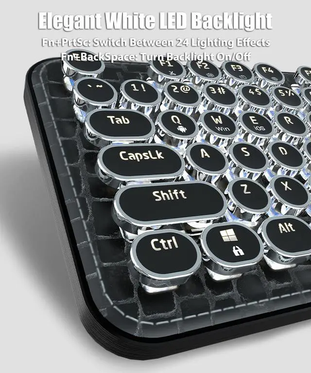 TISHLED Typewriter Keyboard with Faux Leather Panel, Wireless 2.4G /Bluetooth/Wired USB-C, Aesthetic Mechanical Gaming Keyboard 104-Key Clicky Blue Switch, Retro Round Keycap, White LED Backlit, Black