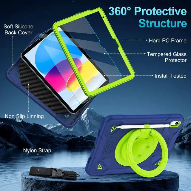 TOMORRY Case for iPad (A16) 11th Generation 11 Inch 2025/10th Generation 10.9 Inch 2022 with Screen Protector 360°Rotating Stand | Shoulder Strap | Pencil Holder | Protective Cover | Navy+Green