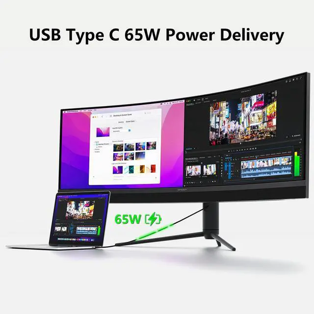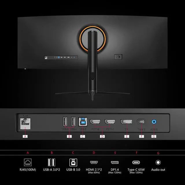 USB Type C, DP and HDMI PortsThis new 45C1R widescreen pc gaming curved monitor delivers powerful USB C power delivery connectivity and have richful interfaces: 1 x DP 1.4, 1 x USB C 65W, 2 x HDMI 2.1, 2 x USB A, 1 x USB-B, 1 x RJ45, 1 x 3.5MM Audio Jack, you can directly connect your USB C devices such as Laptop, Mac, Phones, Tablets, Gaming Console( like Switch, PS5/4/3, XBOX Series etc) . It's much more convenient