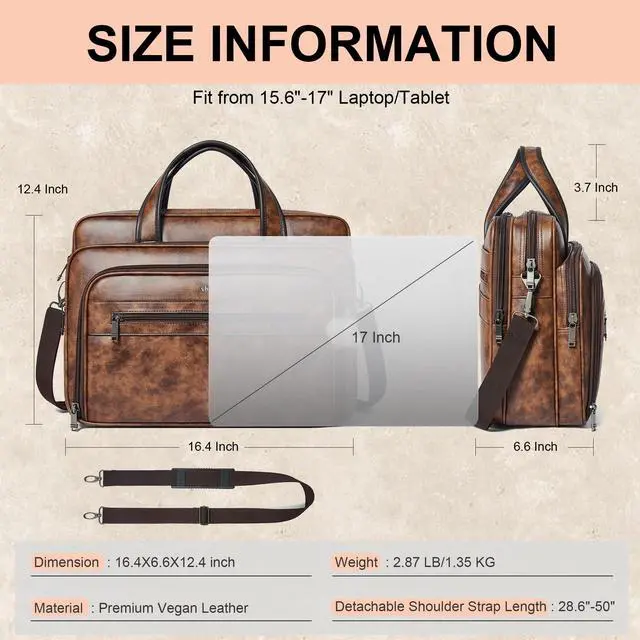VERSATILE LAPTOP BAGThe dimension of this Retro and fashion Leather Messenger Bag is 16.4"L x 6.6"W x 12.4"H,Weight:2.87 LB.Large capacity design can hold all your work necessaries,perfectly fit for people in business and work.Multi usage methods it can be used as a Business Laptop Bag,Crossbody Bag and Shoulder Bag,you can also remove the shoulder strap use it as a Professional Leather Briefcase and carry it use the leather padded handle that could effectively reduce your hand stress