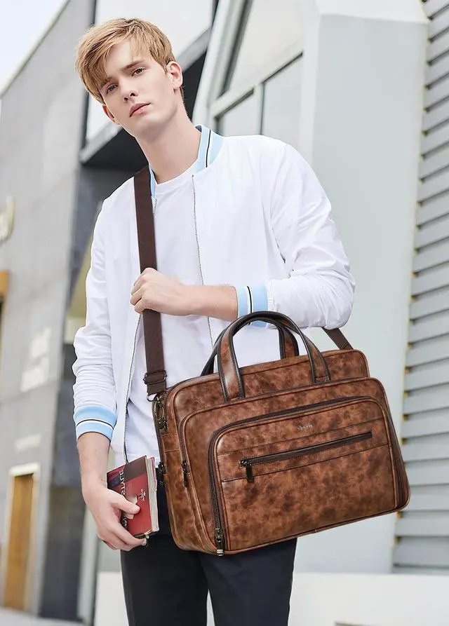 HIGH END MATERIALThis Messenger Bag for Men is crafted from water-resistant,wrinkle-resistant and scratch-resistant premium vegan leather made,which is sturdy and soft texture offer great feeling can stand up everyday use,easily cope with a variety of scenarios such as daily splashes and light rain.Smooth metal zip for durability and strong,reinforced stitching won't easy to crack can be used for a long time.Professional Briefcase designed for the Business Men&Women who chasing practicali