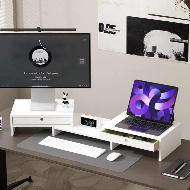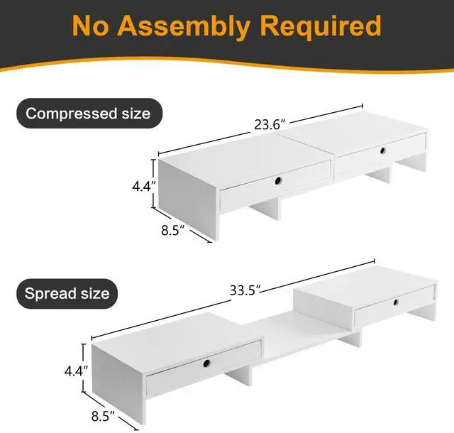 Useful & Orderly: The monitor stand can hold 2 monitors! It may be an ideal choice when you need multiple computers to work together. With 3 storage spaces under the monitor stand, plus 2 drawers, you can organize some office supplies and keep your desk in order.