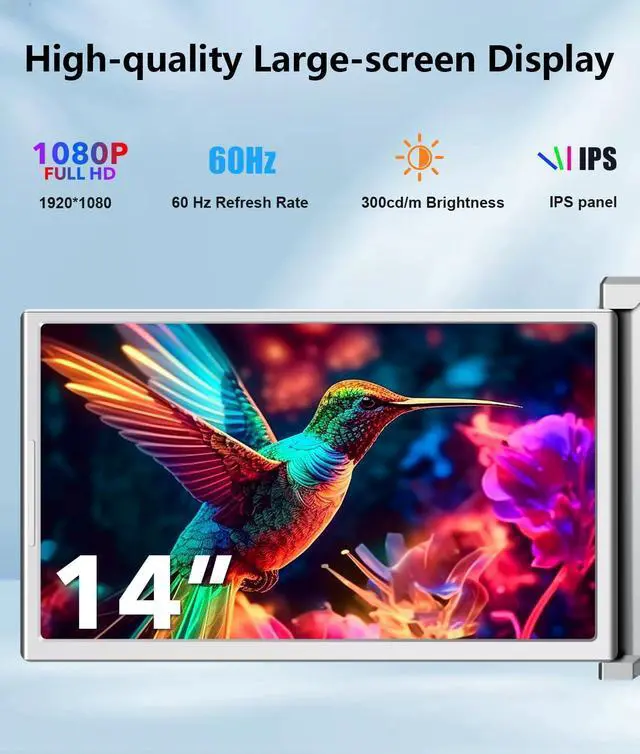 14" For The Best Visual Experience: YUTOO quad laptop screen extender FHD IPS display has 300 nits brightness, 72% NTSC color gamut, 1920X1080 resolution, and 1000:1 contrast ratio, matching the 14" size for the best visual experience, Integrated with the laptop, it provides customers with a wider field of view, more realistic visual effects, and a more comfortable viewing experience. You can also adjust the display settings according to your preferences by operating the multi-function button