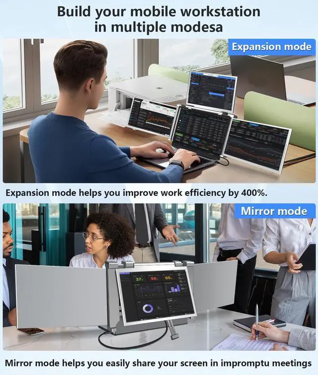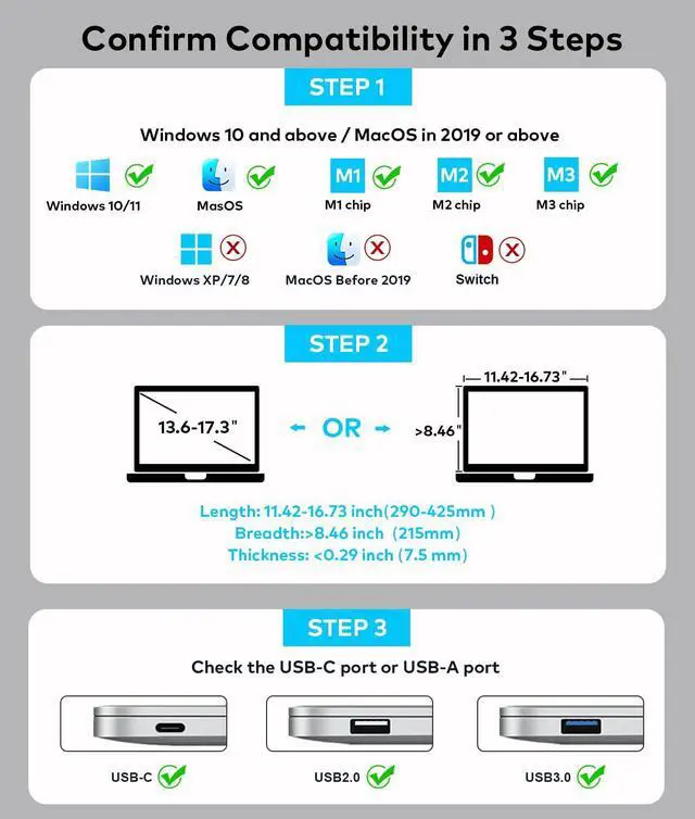 Support M1/M2/M3/Window: The 14" triple portable laptop monitor is designed to be compatible with laptops ranging from 13.3-17.3. With compatibility for M1/M2/M3 Windows laptops and simplified connection options using a single cable, this portable monitor is designed to seamlessly integrate with your existing setup. . Please note that it is currently not compatible with Microsoft Surface series and Chromebook devices. With its generously-sized screen, you can enjoy a remarkabl