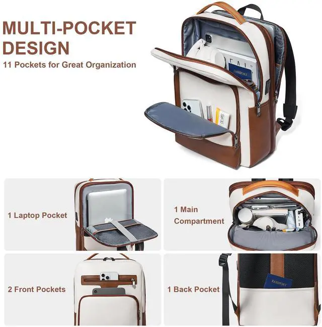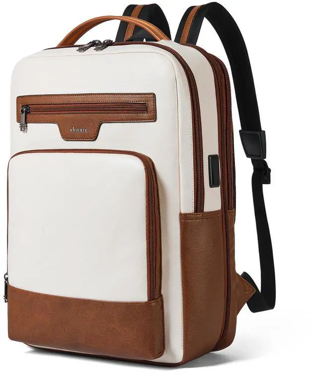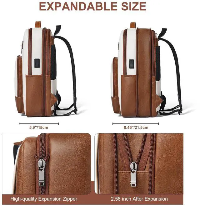 Shrrie Leather Laptop Backpack for Women and Men,28 L Travel Backpack Computer Bag Fits 16 inch Laptop,Expandable Casual Daypack with USB Port for Work Business Weekender College,Beige with Brown