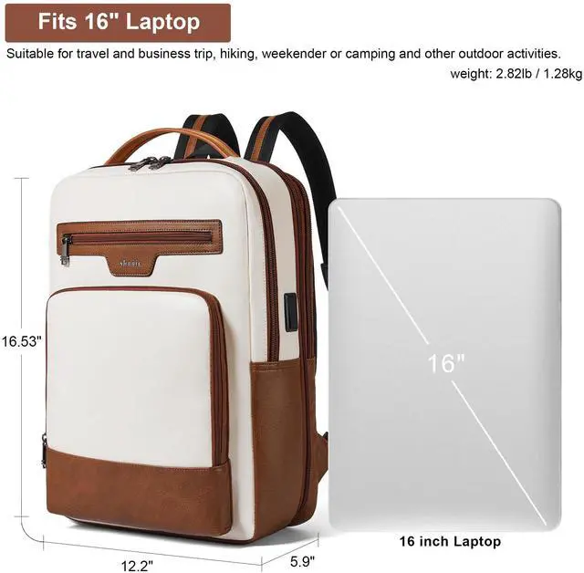 Shrrie Leather Laptop Backpack for Women and Men, 28 L Travel Backpack Computer Bag Fits 16 inch Laptop, Expandable Casual Daypack with USB Port for Work Business Weekender College, Beige with Brown