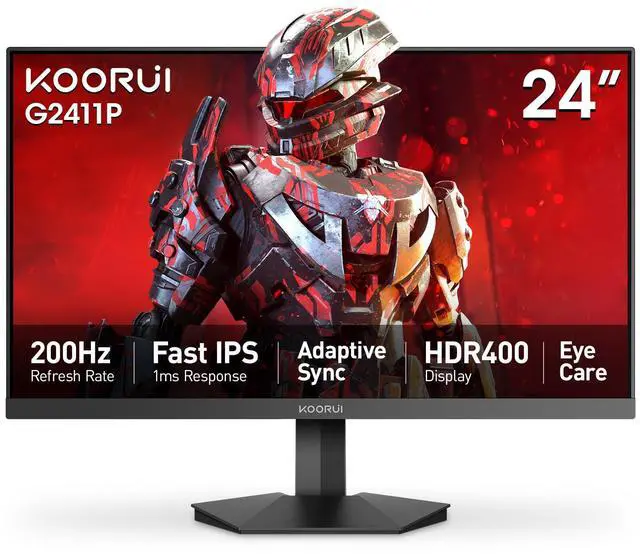 KOORUI 24" Gaming Monitor, 200Hz 1ms Fast IPS, FHD HDR400 Display, 90% DCI-P3 Color Gamut, Adaptive Sync, Ultra Slim Frame, VESA Mountable, HDMI 2.0, DP 1.4, G2411P