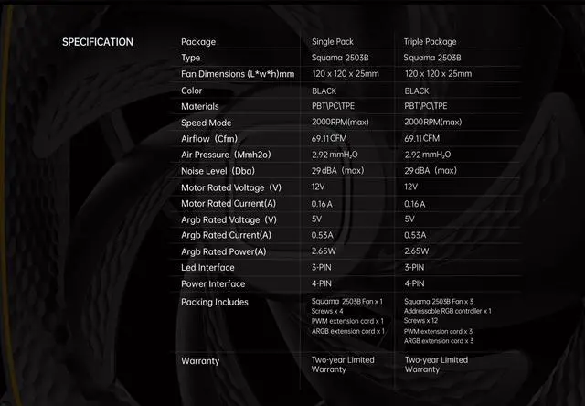 PWM 4-pin PWM controlled fan speed from 800 rpm to 2000 rpm, with excellent balance of performance and quietness, pushing up to 69.11 CFM of air with 2.92mm- HO of static pressure.