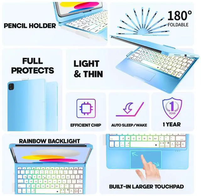 7-Color BacklitThis keyboard for ipad 10th generation features a rainbow backlit. iPad 10th generation case with keyboard has 3 adjustable brightness levels, allowing you to customize the backlight brightness according to your person