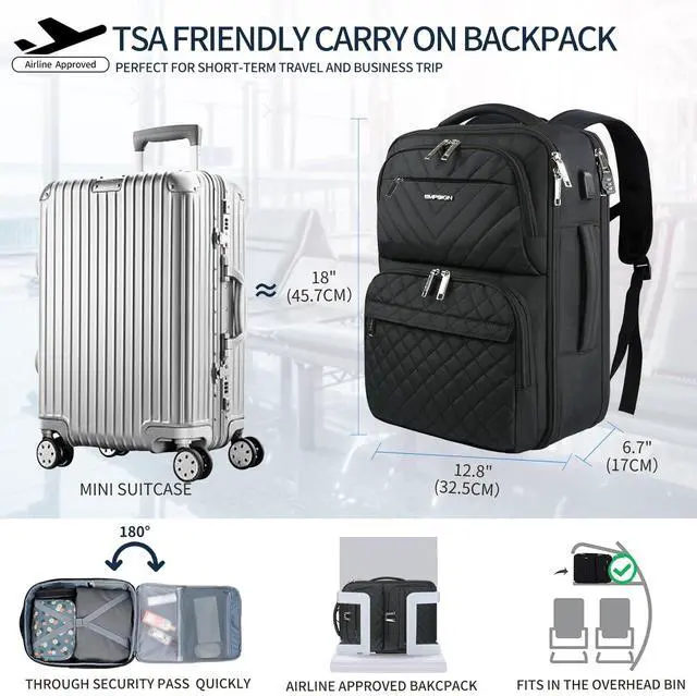 Designed specifically for travel and approved by airlines: This carry on backpack measures 18 x 12.8 x 6.7 inches and weighs 2.1 pounds. It features multiple layers of breathable padding and adjustable breathable straps, providing comfortable carrying experience for hours and reducing stress. At the same time, the backpack is equipped with an adjustable chest strap, providing a better wearing experience. A luggage strap that can secure the backpack to the suitcase.