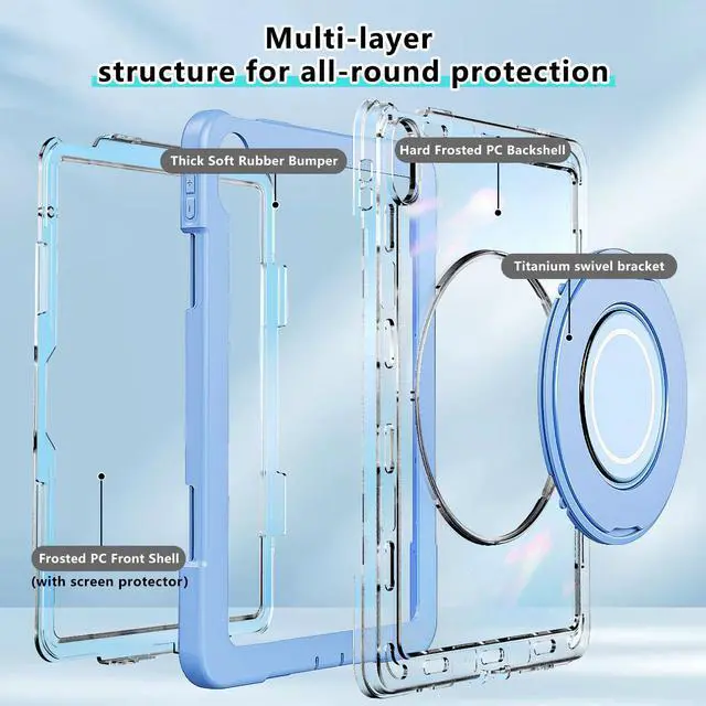 Triple Reinforced Drop ProtectionThe iPad case is made of three layers of durable material, consisting of a sturdy hard acrylic frosted back and front shells, shock-absorbing soft rubber and air corners to provide drop protection, effectively preventing the tablet from accidental drops, bumps and slides that can cause damage