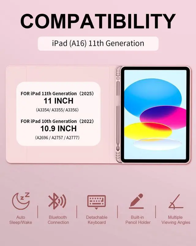Compatibility ModelThis iPad case with keyboard is designed for iPad A16 11th/10th Generation 2025/2022 10.9/11 inch. ( Model: A3354/A3355/A3356/A2696/A2757/A2777 ). NOT compatible with any other iPad models. Please check the back bottom of your iPad to find the model number before placing order.