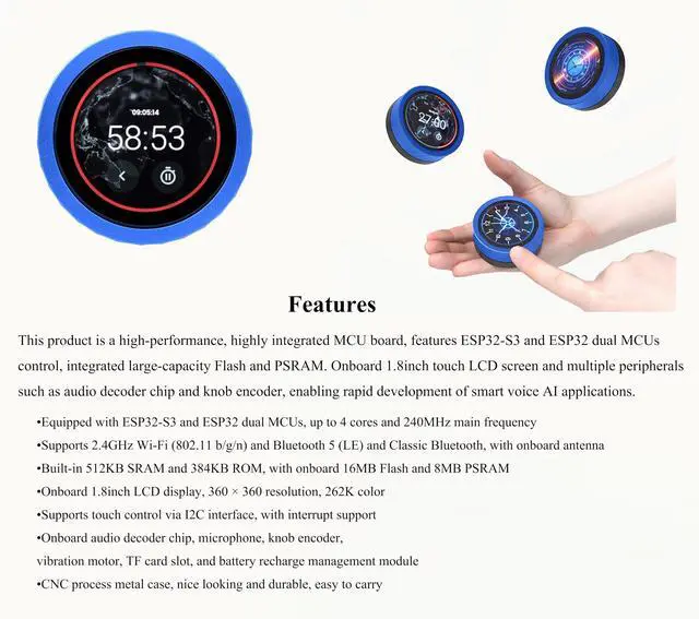 Onboard 1.8inch LCD display, 360 x 360 resolution, 262K color. Supports touch control via I2C interface, with interrupt support. Onboard audio decoder chip, microphone, knob encoder, vibration motor, TF card slot, and battry recharge management module. CNC process metal case, nice looking and dur-able, easy to carry.