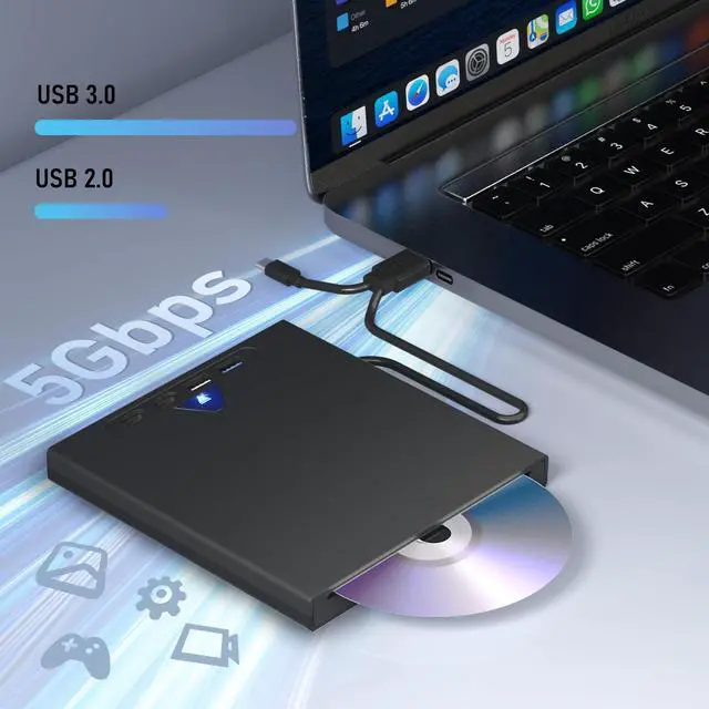 High-speed Transfer: Our external blueray/dvd drive for pc features a dual interface design with USB 3.0 and Type-C ports, ensuring fast transfer speeds. The external blu ray drive interface transfer speed reaches up to 5Gbps, enabling rapid reading and writing of disc data and reducing waiting time. External bluray drive read and write CDs speed can reach up to 24x , DVDs up to 8x , and Blu-ray discs up to 6x
