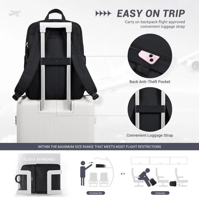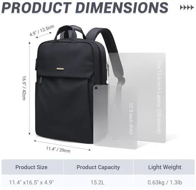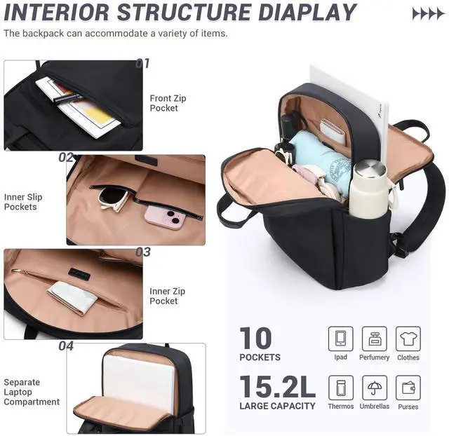 Spacious and Organized - The women laptop backpack features a separate laptop compartment that can accommodate a 15.6 inch laptop. The spacious interior features multiple pockets for organizing various everyday items. On the exterior, there's one zippered front pocket, one front slip pocket, and two side pockets to keep your items organized.