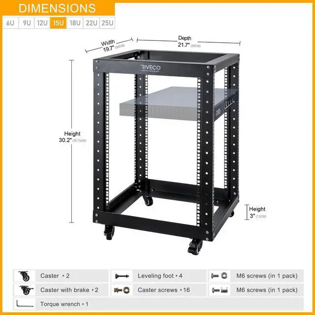 SIZE: Width 19.7" (500 mm), Depth 21.7" (550 mm), Height 33.2"842.5 mm with casters. Also other heights 6U, 9U, 12U, 18U, 22U, 25U are available. RIVECO portable rolling network rack series is versatile for 19" standard equipment and devices