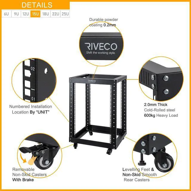 RIVECO 15U Server Rack Floor Standing Open Frame with Wheels- 19-inch 4 Post Quick Assembly AV Rack Network Heavy Duty Durable Black
