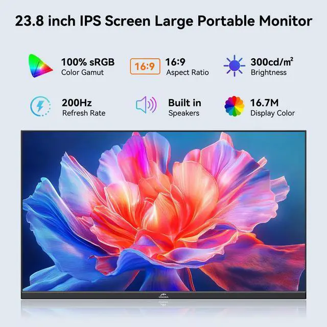 23.8 Large Portable Monitor: The 23.8 portable monitor enhances immersive visual experiences. Featuring an FHD 1080p IPS panel with a 200Hz refresh rate, it delivers vibrant colors and smooth performance for gaming, streaming, and multitasking. With a 178° wide viewing angle and 100% sRGB color gamut, every scene is displayed with near-realistic precision and detail.