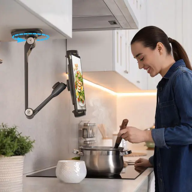 [360°Swivel Base]Most tablet wall mount bases can't rotate, which means that if the postion of the base is not suitable after installation, it will be very difficult to adjust the angle.Our tablet wall mount base can 360°swivel,the arm can be rotated 135°or fully folded,and the clamp can be rotated 360°.Mult-angle adjustment,each joint can be rotated and fixed to the position you want.