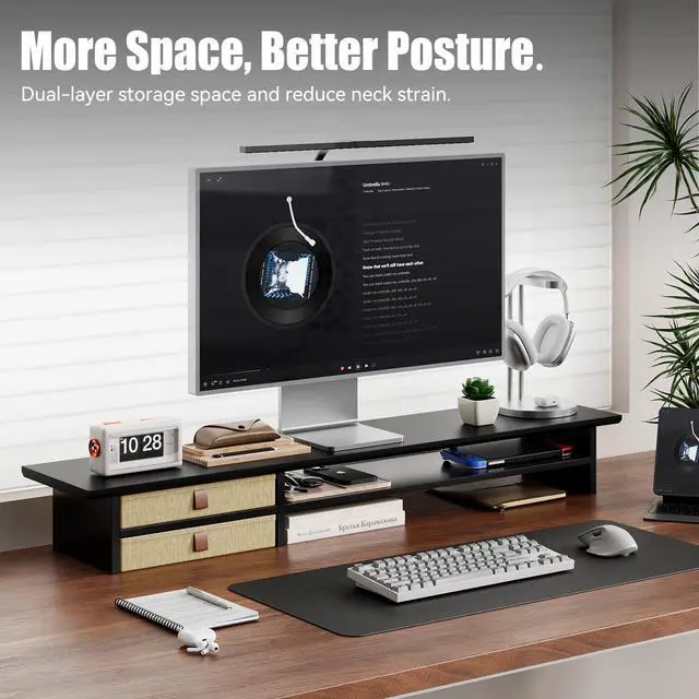 DUAL-TIER DESIGN: Elevated monitor stand with spacious top shelf for display and bottom shelf for storage, maximizing desk organization and workspace efficiency