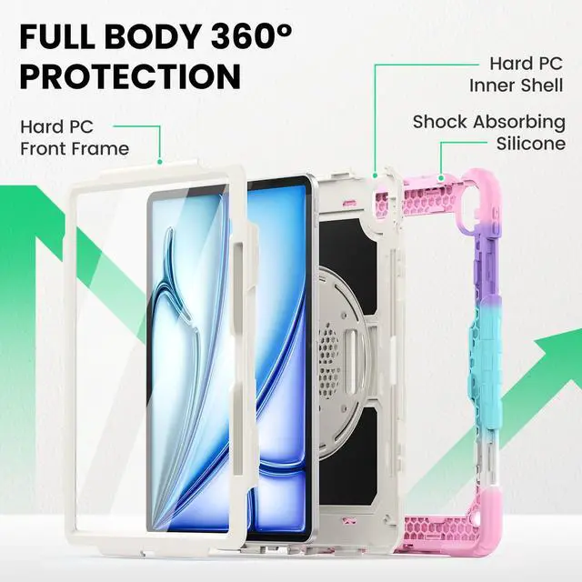 SEYMAC for iPad Air 13 Inch Case M3 2025/ M2 2024, Heavy Duty Shockproof Protective Case with Screen Protector, Rotating Stand, Hand/Shoulder Strap and Pen Holder for iPad Air 13, Colorful Pink