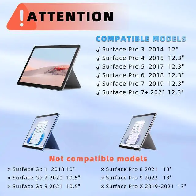 : This keyboard specially designed for Microsoft surface pro 7 Plus(2021), surface pro 7 (2019), surface pro 6 (2018), surface pro 5 (2017), surface pro 4 (2015) 12.3 inch, surface pro 3 (2014) 12 inch tablet. NOT fit for Pro 2, not fit Pro 9/8/X, please kindly check your tablet model carefully before purchase. (tablet not included)