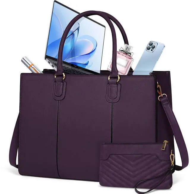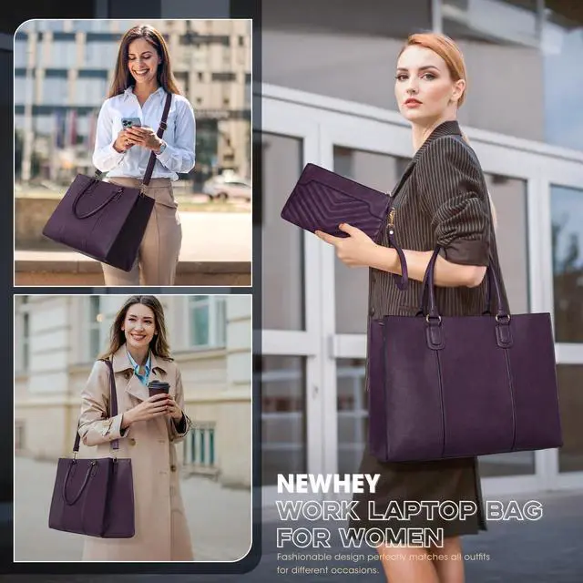 NEWHEY Laptop Bag for Women 15.6 Inch Work Tote Bags Leather Computer Bag with Clutch Purse Professional Office Briefcase Waterproof Handbag for Business Travel College, Deep Purple