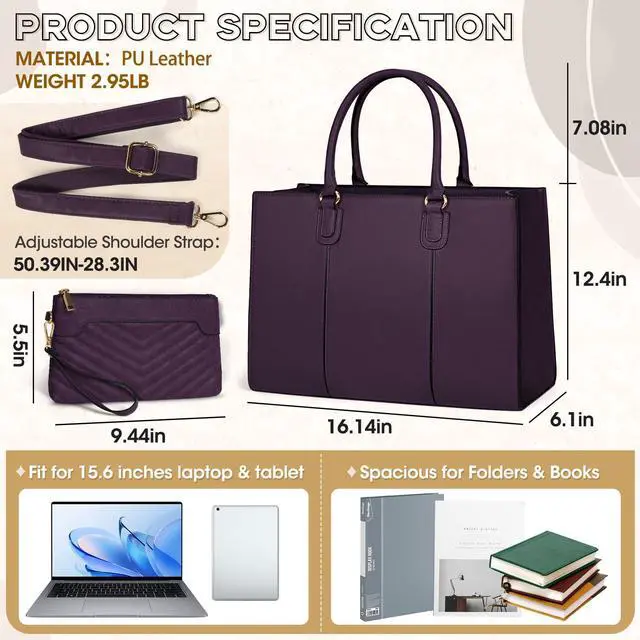 PERFECT SIZE & MULTI CARRYING OPTIONS: The women laptop tote bag sizes in 16.14"x6.10"x12.40"(L*W*H) which is suitable for most 13"/14"/15"/15.6" laptops. Net Weight: 2.71LB. The detachable shoulder strap is 50.39'' to 28.3'' long which fits different heights. With solid top handle and an adjustable shoulder strap, this professional work bag can easily transform between computer briefcase, tote bag, shoulder bag, messenger bag, handbag and crossbody bag to match various outfits.
