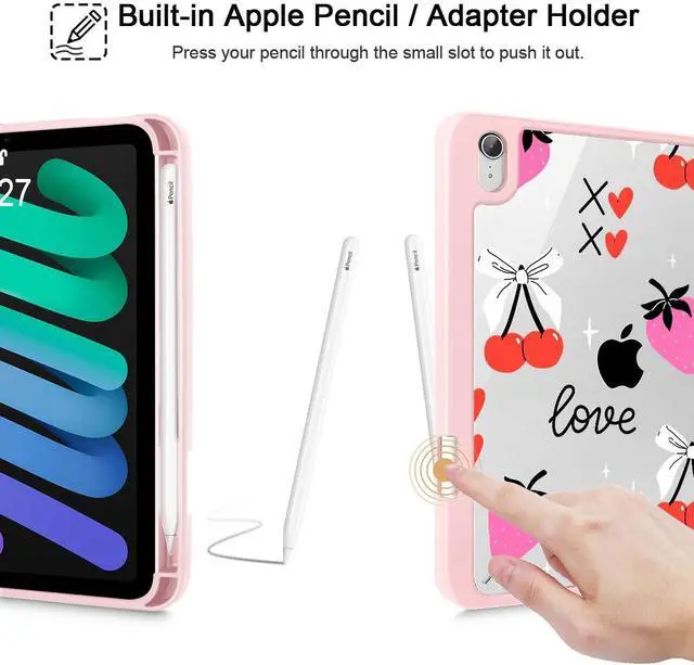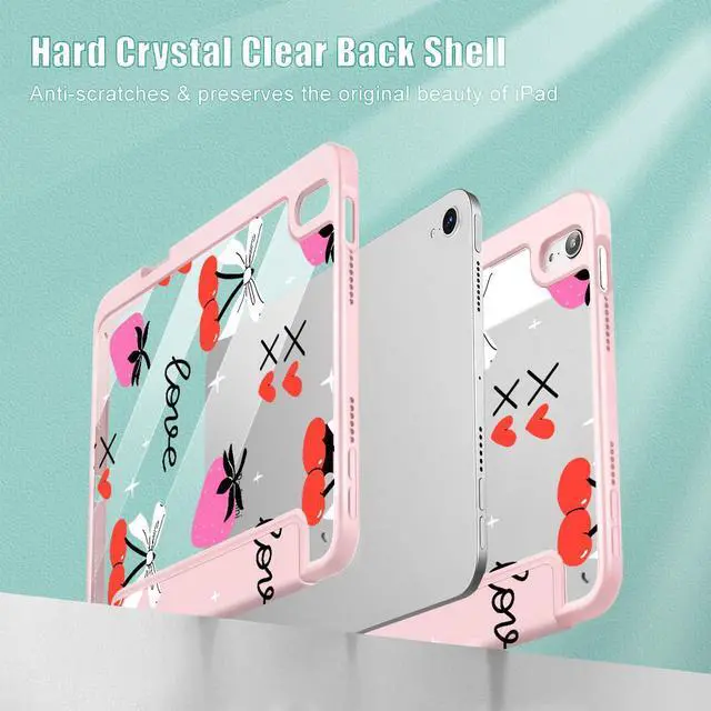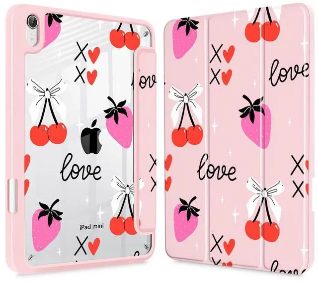 Mektron Printed Case for iPad mini 7 (A17 Pro) 2024/ Mini 6 2021, iPad mini 7th/6th Generation Case, Buit in Pencil Holder with Clear Back Shell + Trifold Stand, Cherry with Strawberry