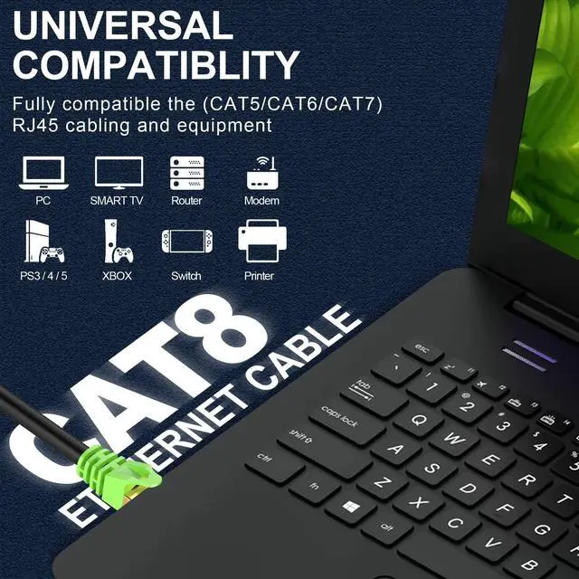 Widely Compatible Cat8 ethernet cable with gold-plated RJ45 connector, perfectly compatible with routers, modems, switch, PC, laptops, PS5, PS4, PS3, X-Box 360, X-Box One, Coupler, Hubs, Keystone jack, Smart TV, Imac and other devices, also backward compatible with Cat6, Cat5e, Cat5.