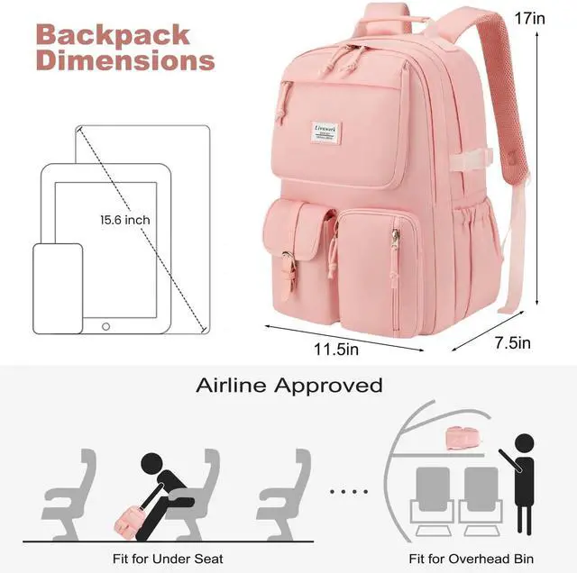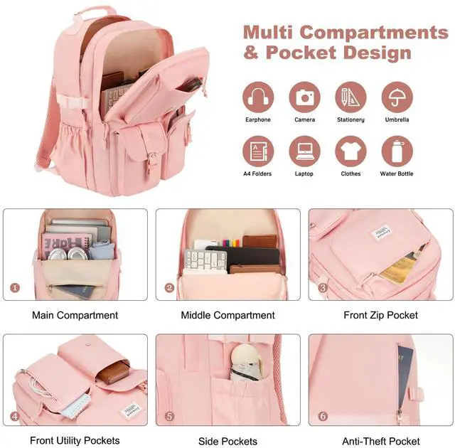 Multiple Pockets College Backpack: Women laptop backpack has 15 pockets, including a padded laptop compartment in the main compartment that fits a 15.6" laptop, a middle compartment for clothes, books, notebooks, magazines, and more, 4 front pockets for phone, earphone, pencil case, sticky notes, and other small items, 2 side pockets for water bottle and umbrella