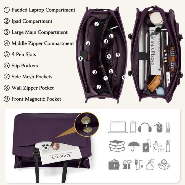 LARGE CAPACITY & MULTI-POCKETS: This work tote bags for women offers spacious storage capacity. 1 foam padded laptop compartment for 15.6" laptop, 2 large open compartments and 1 middle zipper pocket for files and books, 1 wall zippered pocket for personal belongings, multi-functional pockets with keychain for keys, pens, wallet etc, 2 inner side pockets for water bottle and umbrella. Front magnetic pocket for items easy to access and back zipper pocket for phone or passport