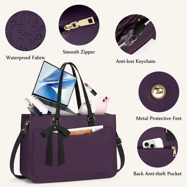 RAINSMORE Laptop Bag for Women 15.6 Inch Work Tote Bags Leather Laptop Tote Waterproof Computer Bag Professional Office Briefcase Large Handbag for College Teacher Travel, Purple and Black