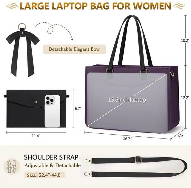 FASHION-FORWARD LAPTOP BAG FOE WOMEN: Modern fashion look combined with a detachable sophisticated bow creates a timeless yet trendy aesthetic, effortlessly versatile for any outfit or occasion. 4 metal feet on the bottom ensure this laptop tote bag stand upright and keep its shape perfectly, making this bag looks more elegant
