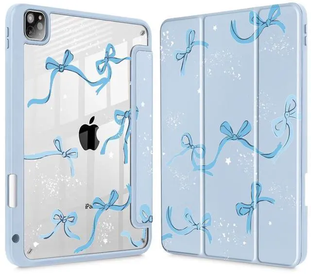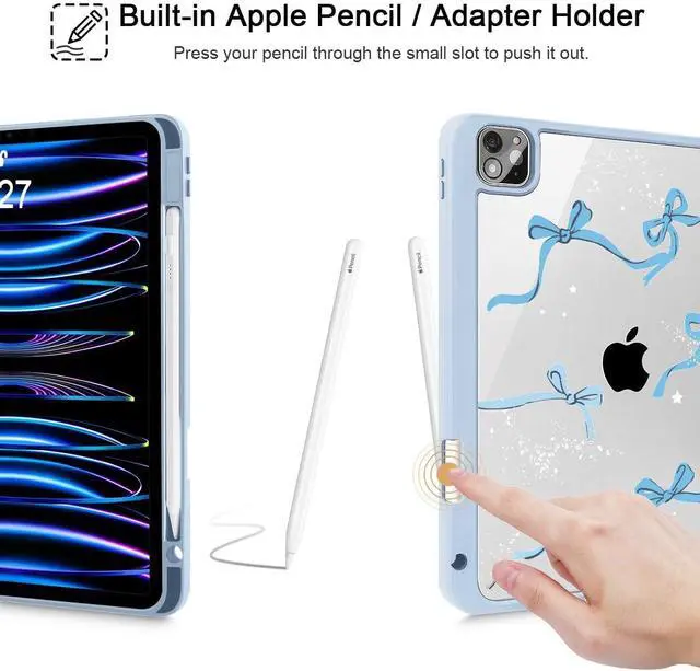 Tuiklol for iPad Pro 11 Inch Case M2 2022 Generation 4th -Built-in Pencil Holder Shockproof Cover Clear Transparent Back Shell Fit for iPad 11 2021 2020 2018 Gen 3rd/2nd/1st for Kid, Bow-Blue