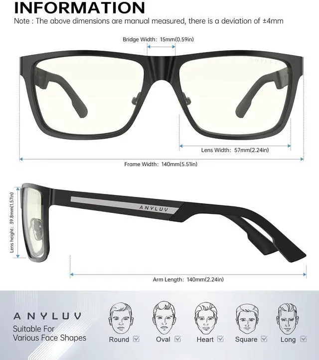 Blue Light Blocking Rate: ANYLUV blue light glasses can block harmful blue light. This pair of transparent blue light glasses features clear lenses and low color distortion, providing a perfect balance between eye protection and visual quality, and significantly reducing the harmful blue light emitted by electronic screens. Men's blue light glasses are suitable for various scenarios, such as working on a computer, playing games and watching digital screens.