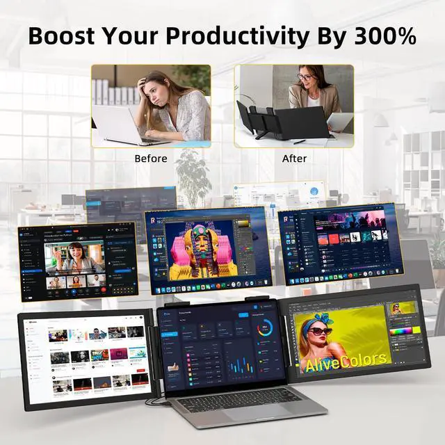 Premium Display Quality - Our full HD monitor extension for laptop boasts a resolution of 1920×1080P, featuring exceptional 300 nit brightness, a 72% NTSC color gamut, and a 1000:1 contrast ratio. With a low blue light mode, Triple Screen Laptop Monitor Extender minimizes eye strain while delivering an expanded viewport, lifelike visuals, and an extremely comfortable viewing experience.