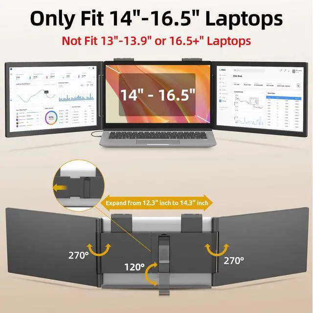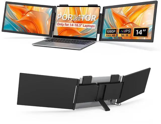 Laptop Screen Extender - 14 Inch Triple Portable Monitor IPS FHD 1080P 3-Type-C External Screen with Windows Mac Travel Work for Laptops Compatible, Fits 14"- 16.5" Laptops