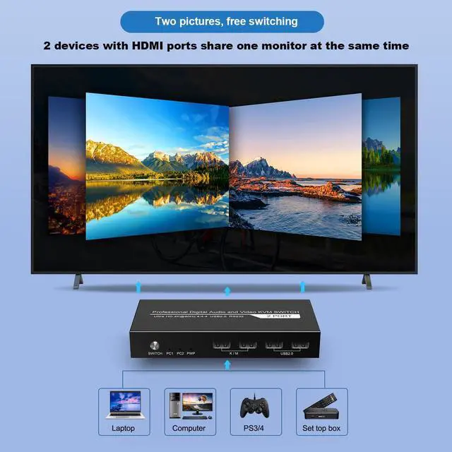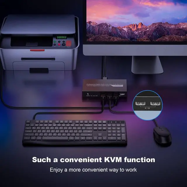 4K@60Hz 4:4:4Experience ultra-HD 4K visuals with stunning realism and detail at up to 60Hz/3D 4:4:4 resolution, thanks to HDR10 technology and Dolby Atmos support. With this KVM switch, you'll enjoy an unparalleled viewing and gaming experience.